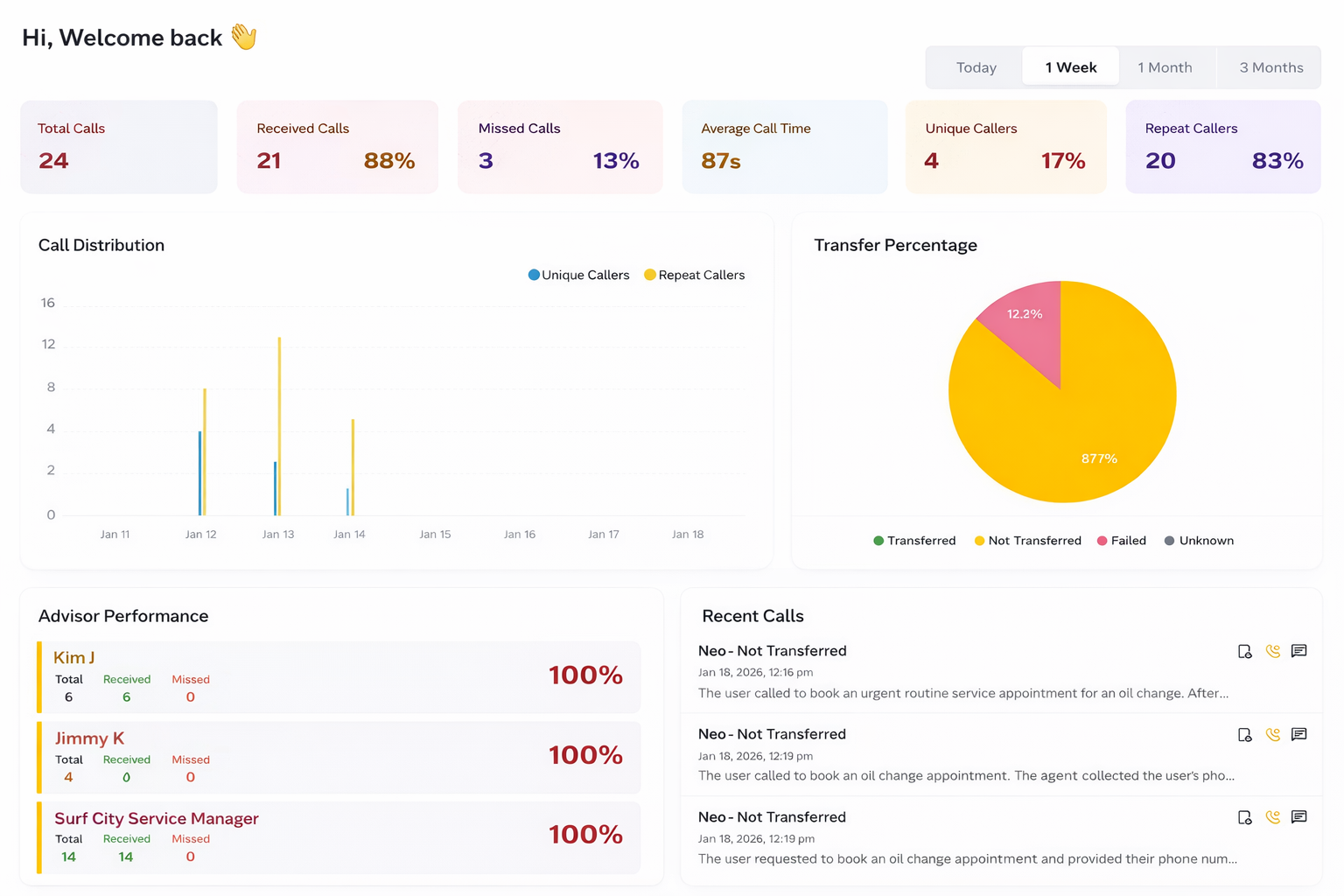 Comprehensive insights that help dealerships understand call patterns, team performance, and customer engagement.